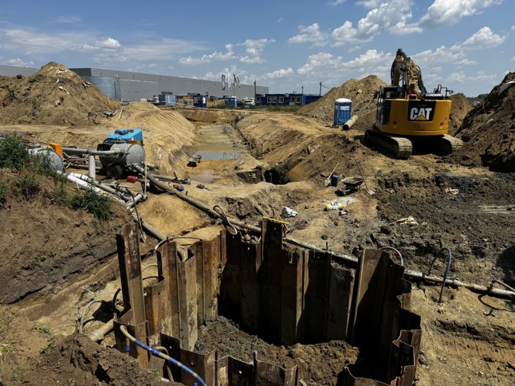 A teljes 640 hektáros területet érintő közmű- és útsávokban a tereprendezés folyamatosan zajlik, mely keretében a humuszleszedés teljesen elkészült. 90 százalék feletti készültségi állapotban van a geotextília leterítése, a töltésépítés és a bevágások készítése.