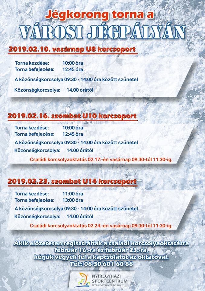Jégkorong mérkőzéseket rendeznek február 10-én Nyíregyházán! A Városi Jégpályán az U8-as korcsoport számára tartanak egy tornát mely 10 órakor kezdődik. A következő hetekben több hasonló jégkorong utánpótlás mérkőzést rendeznek a szabolcsi megyeszékhelyen, február 16-án az U10-es, február 23-án az U14-es korcsoport lép jégre. A tornák ideje alatt a közönségkorcsolyázás szünetel.