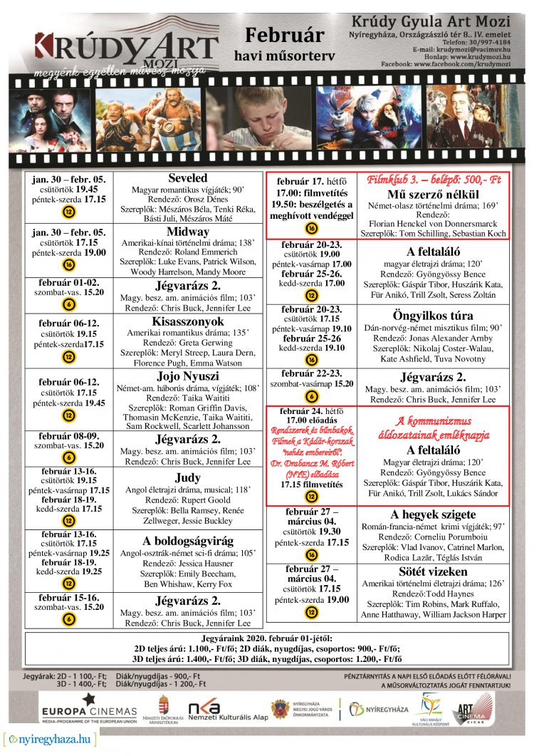 A színes filmkínálat mellett filmklub is lesz februárban a Krúdy Art Moziban, a Mű szerző nélkül című filmet tekinthetik meg az érdeklődők.