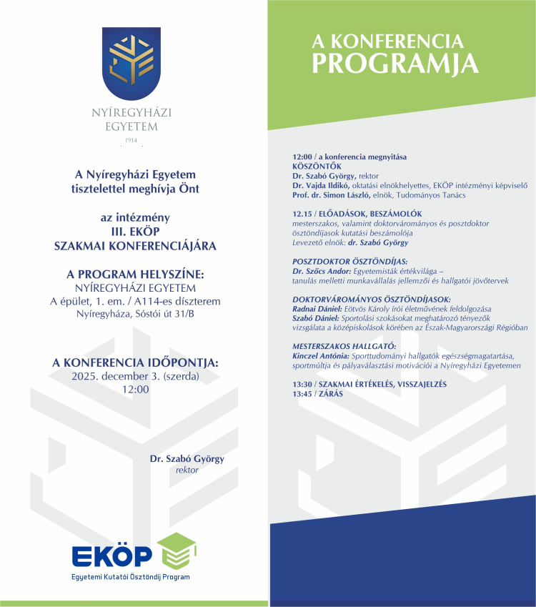 A Nyíregyházi Egyetem idén is átadja az Egyetemi Kutatói Ösztöndíj Program (EKÖP) támogatásait. A tudományos utánpótlás erősítését szolgáló ösztöndíjakat összesen kilenc pályázó nyerte el a több mint 18 millió forint összegű támogatási keretből.
