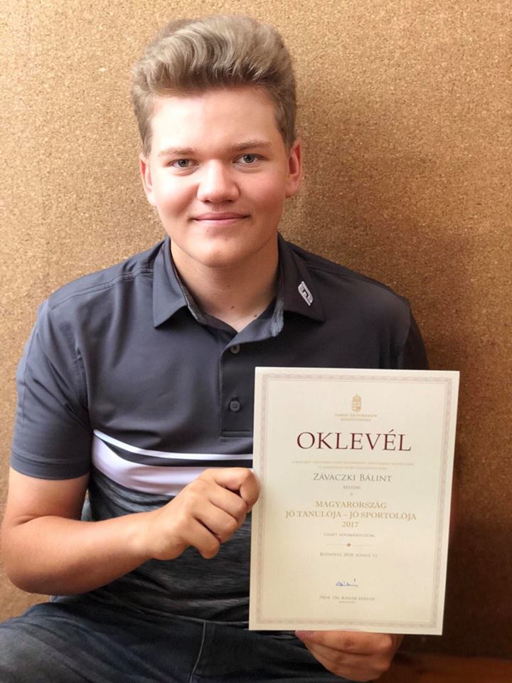 Az Emberei Erőforrások Minisztériuma idén is meghirdette a "Jó tanuló-jó sportoló" pályázatot. A részvétel alapfeltétele volt a kiváló tanulmányi átlag mellett minimum három hazai és három külföldi, nemzetközi mezőnyben elért top 6-os eredmény. Závaczki Bálint 2017-ben is magasan megfelelt a pályázati kritériumoknak, így immáron harmadszor kapta meg az elismerő oklevelet Prof. Dr. Kásler Miklós minisztertől. Az ifjú golfozó számára ugyanolyan fontos a tanulmányi eredmény, mint a golfpályán elért sikerek. Vallja, hogy az élsport és a kiváló tanulmányi eredmény együttesen hozhatja meg számára a sikereket.
