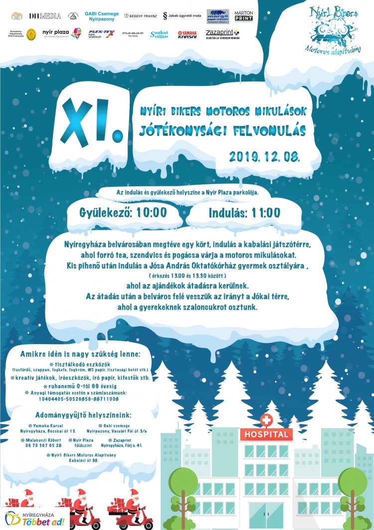 XI. alkalommal vonulnak fel Nyíregyháza belvárosában mikulásnak öltözött motorosok december 8-án. A látványos felvonulást követően ajándékokat adnak át a Jósa András Oktatókórház gyermek osztályán, valamint szaloncukrot osztanak a Jókai téren sétáló kicsiknek.