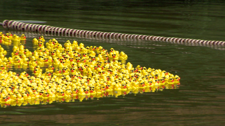 Jótékonysági kacsaúsztatás – Több ezer gumikacsa lepte el a Sóstói Csónakázó-tavat