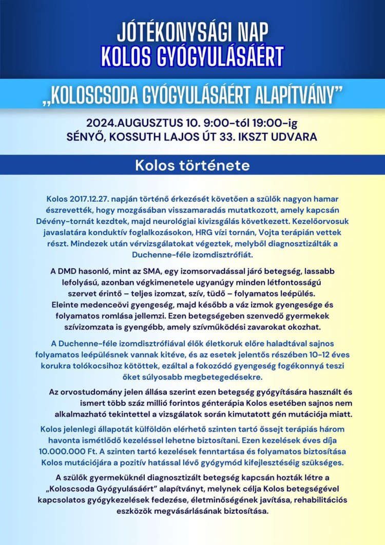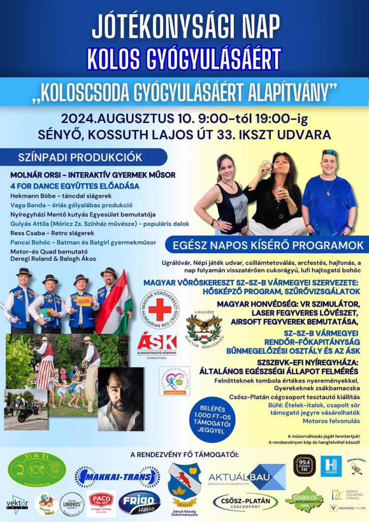 Egész napos jótékonysági programot szervez a Koloscsoda Gyógyulásáért Alapítvány augusztus 10-én, 9 órától a IKSZT udvarán, Sényőn (Kossuth Lajos út 33.). A rendezvény célja, hogy támogassák Kolost, aki egy ritka betegségben szenved.