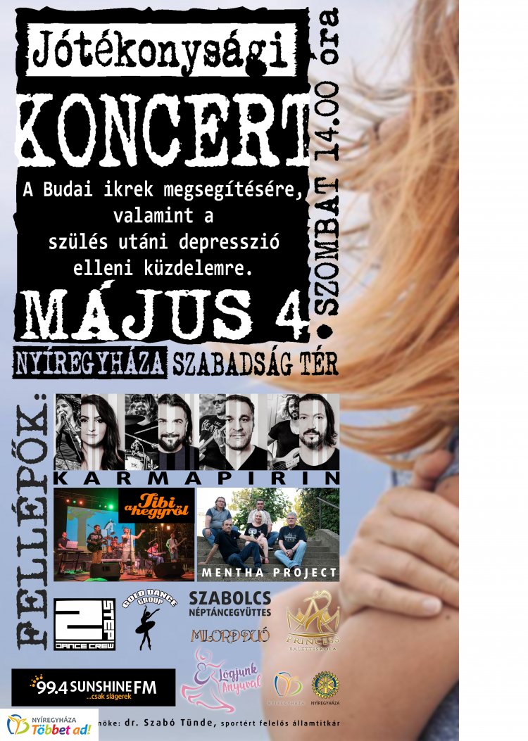 A 99,4 Sunshine FM és a „Lógjunk anyuval" tánccsoport a Budai ikrek, Zsombor és Lia, valamint az édesapa, Budai Ferenc megsegítésére jótékonysági koncertet szervez május 4-én, szombaton 14 órától Nyíregyházán, a Szabadság téren, ahol támogatói jegyek megvásárlásával járulhatnak hozzá a család megsegítéséhez.
