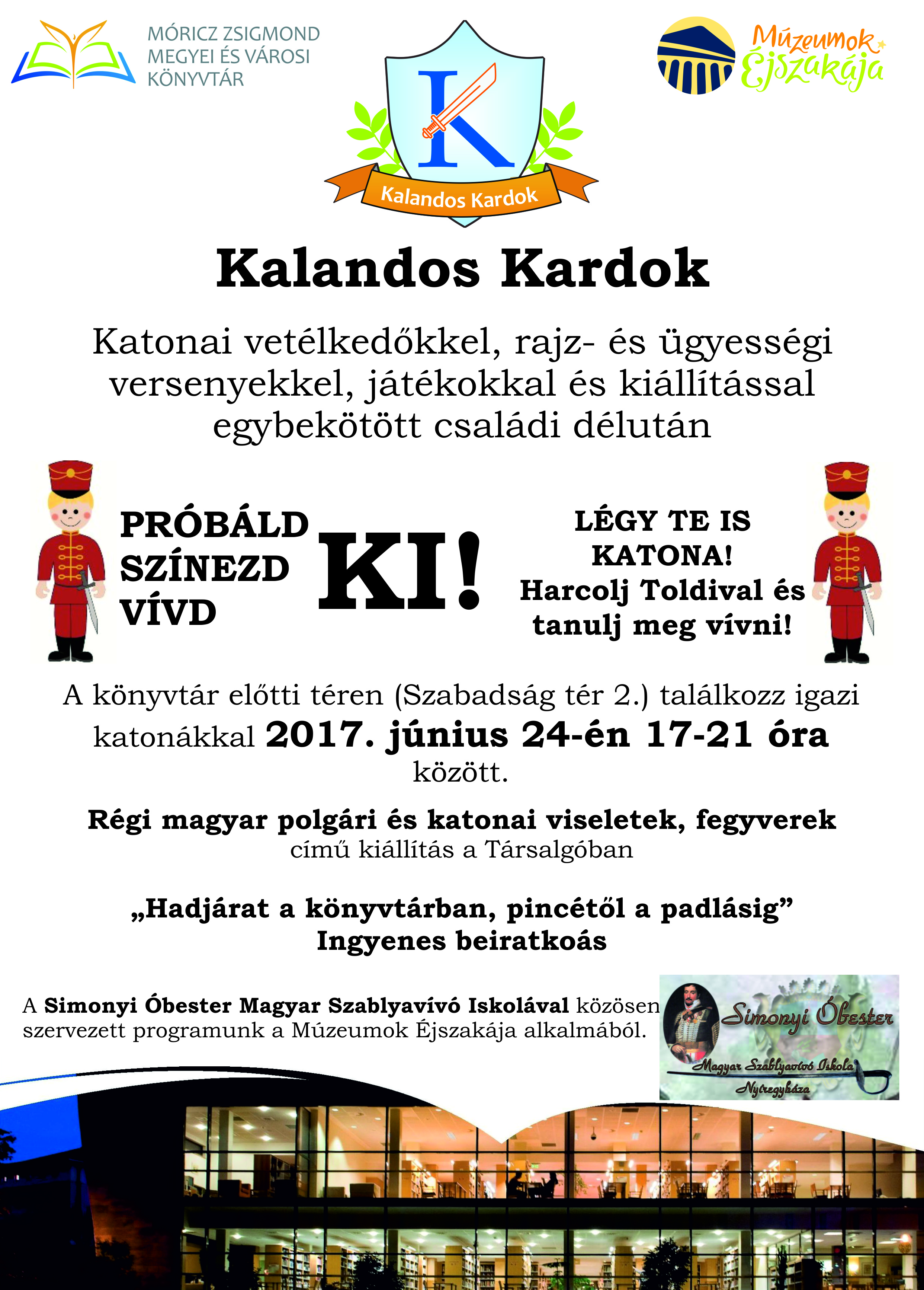 A gyerekek RAJZVERSENYEN vehetnek részt. A rajzokat megosztjuk a könyvtár Facebook oldalán és a közönségszavazatok alapján díjazzuk a legjobbakat. A készített rajzokból kiállítást szervezünk. A legkisebbek különböző KATONAI SZÍNEZŐvel fejleszthetik kézügyességüket. A család nagyobb tagjait pedig a Társalgóban a RÉGI MAGYAR POLGÁRI ÉS KATONAI VISELETEK, FEGYVEREK című kiállítás várja, Kulcsár Róbert magángyűjtő tárlatvezetésével.
