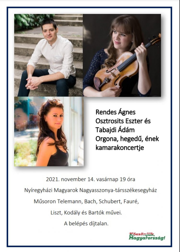 Rendes Ágnes, Osztrosits Eszter és Tabajdi Ádám ad kamarakoncertet november 14-én a római katolikus templomban. Műsoron - többek között - Liszt, Kodály és Bartók művei. A belépés díjtalan.