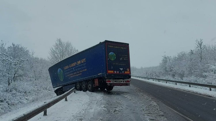 Átszakította korlátot, majd árokba csúszott egy kamionos a csúszós, havas úton. Ahhoz, hogy kihúzzák műszaki mentésre volt szükség. A baleset és a mentés miatt ezen a szakaszon egy sávra szűkült a forgalom.