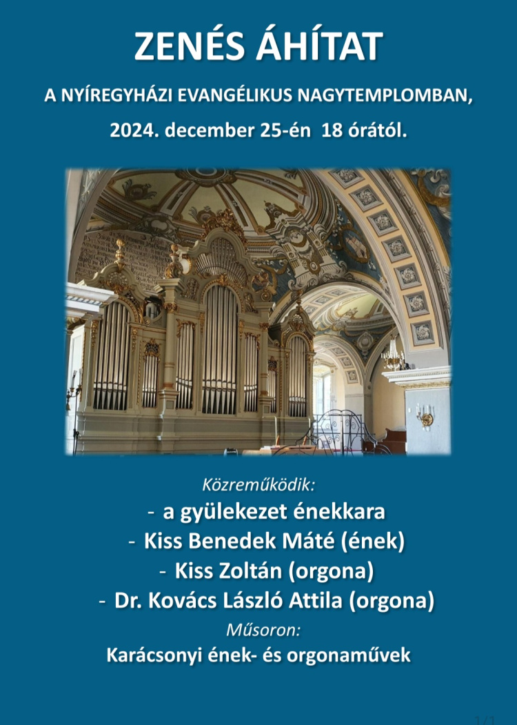 A Nyíregyházi Evangélikus Egyház szeretettel hívja és várja az érdeklődőket ünnepi zenés áhítatára december 25-én este 18 órakor az evangélikus nagytemplomba.