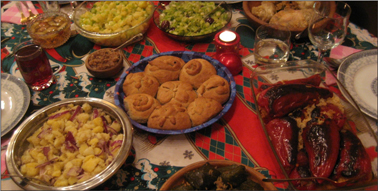 A vacsora fokhagymával és borssal ízesített mézes ostyával kezdődik, káposzta-, gomba- vagy bablevessel folytatódik, ezután pedig rántott hal következik krumplisalátával. Édességek közül a mákos guba, a diós, mákos bejgli, valamint a pozsonyi kifli sem hiányozhat az asztalról.