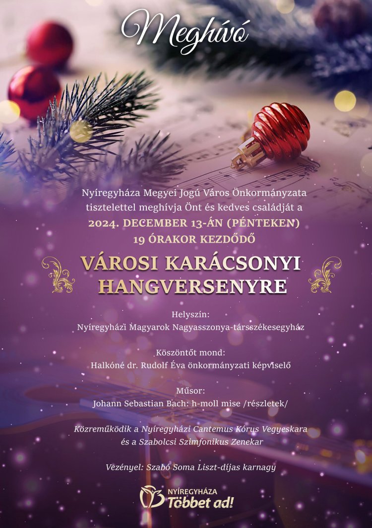 A hagyományos Karácsonyi Koncert december 13-án (pénteken) 19.00 órakor kezdődik a Magyarok Nagyasszonya Társszékesegyházban. A Nyíregyházi Cantemus Kórus Vegyeskara és a Szabolcsi Szimfonikus Zenekar közös, ünnepi műsorral készül, hogy már megszokhatták a nyíregyháziak.