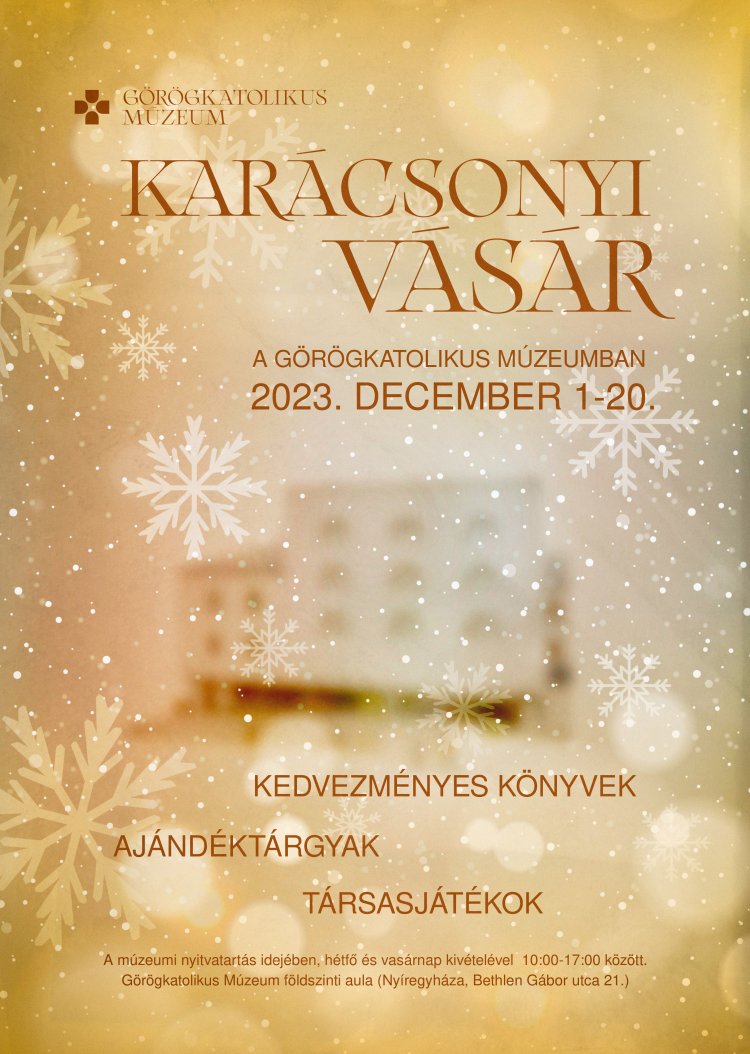 Az ünnepi készülődés része a Görögkatolikus Múzeumban december 1-jén, pénteken megnyíló karácsonyi vásár. A múzeumba látogatók ebből az alkalomból kedvezményes áron válogathatnak a könyvek, játékok és ajándéktárgyak között. A karácsonyi vásár december 20-ig várja az érdeklődőket a múzeum nyitvatartási idejében keddtől szombatig 10 és 17 óra között.