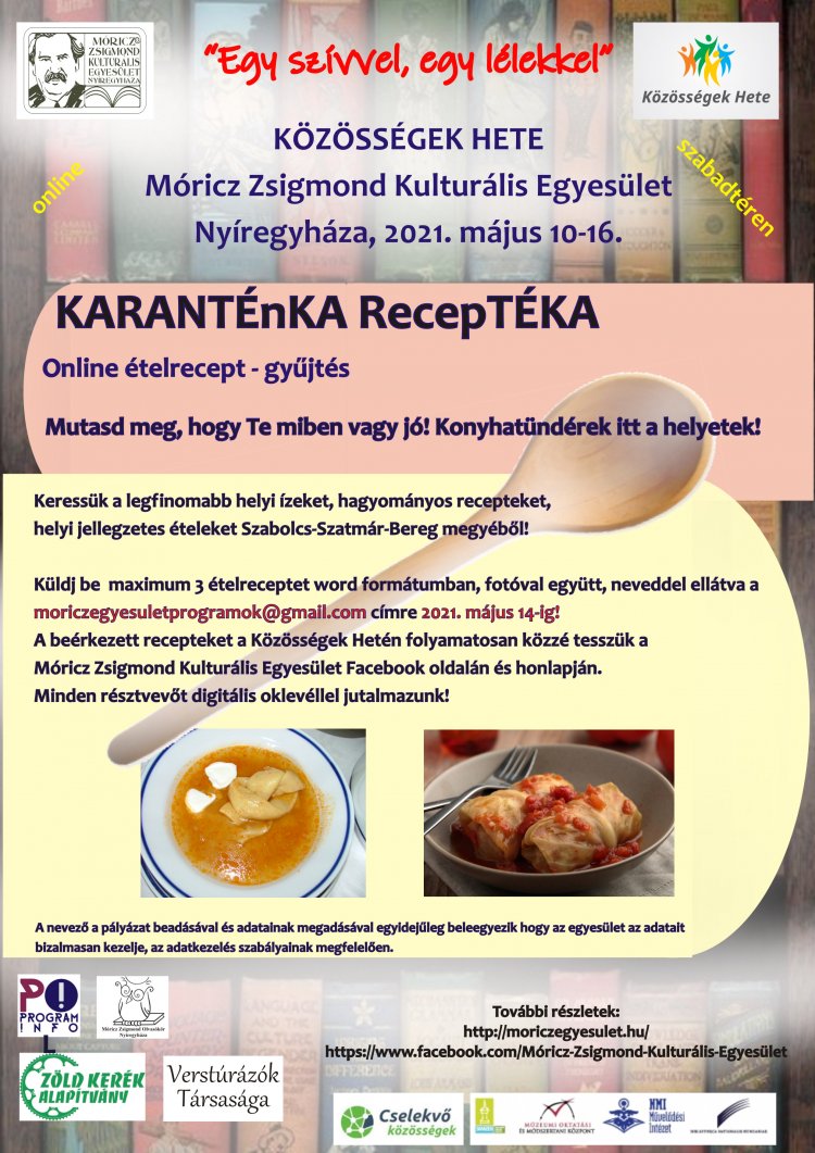 A Móricz Zsigmond Kulturális Egyesület, kapcsolódva a Közösségek Hete országos programsorozatához, online ételreceptgyűjtést hirdet. A legfinomabb helyi ízeket, hagyományos recepteket, helyi jellegzetes ételeket keresik Szabolcs-Szatmár-Bereg megyéből. A recepteket május 14-ig várják.
