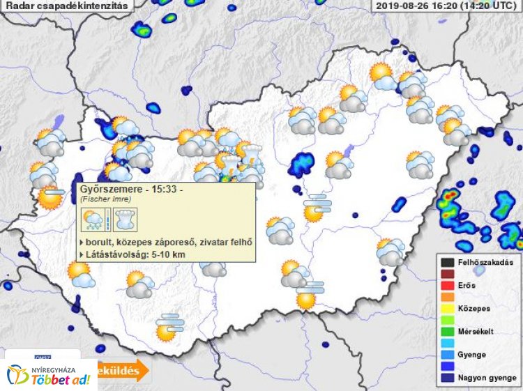 A fátyol- és gomolyfelhők mellett hétfőn valamivel kevesebb, kedden több napsütésben bízhatunk. Szórványosan – kedden kisebb eséllyel délkeleten – alakul ki zápor, zivatar, helyenként felhőszakadással kísérve. A délkeleti, keleti szél napközben helyenként megélénkül, de zivatarok környezetében erős vagy viharos széllökések is lehetnek.
