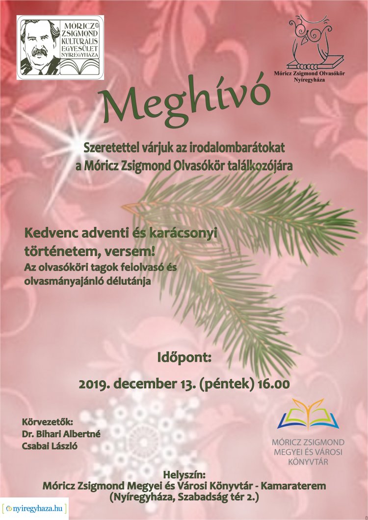 Felolvasó és olvasmányajánló délutánt tartanak a Móricz Zsigmond Olvasókör tagjai december 13-án, a megyei könyvtárban.