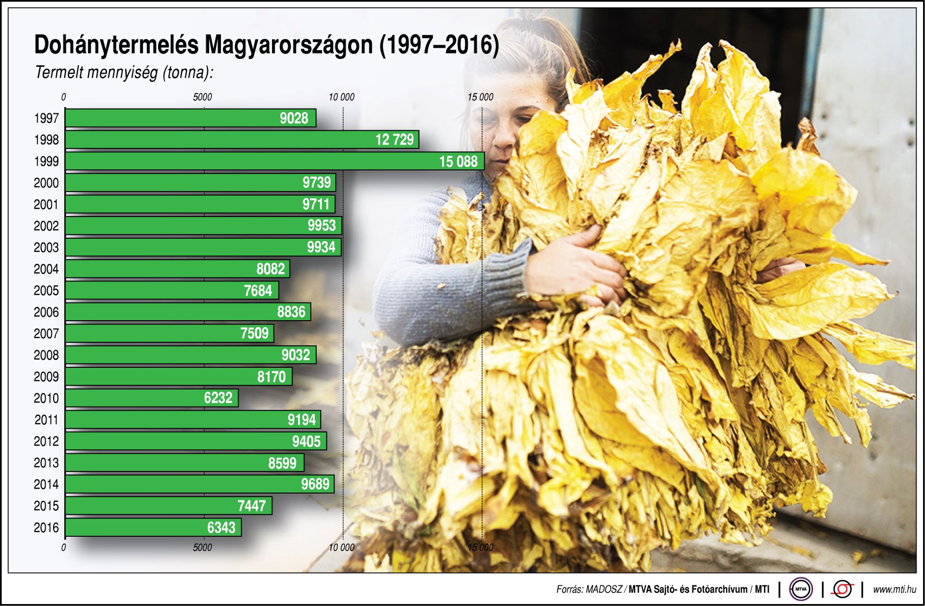 Bényei Illés, a Magyar Dohánytermelők Országos Szövetségének (Madosz) elnöke szerdán az MTI-nek elmondta, ebben az évben 3386 hektárra kötöttek termelési szerződést a felvásárló társaságok a gazdálkodókkal, ami húsz hektárral haladja meg az előző évit. Tájékoztatása szerint 2300-2400 hektáron a Virginia, a maradékon pedig a Burley dohányfajtát termesztik. A betakarítást több termelő már a múlt héten elkezdte, a dohánylevelek törését a gazdák nagyobb része azonban ezen a héten kezdte, vagy kezdi majd el.