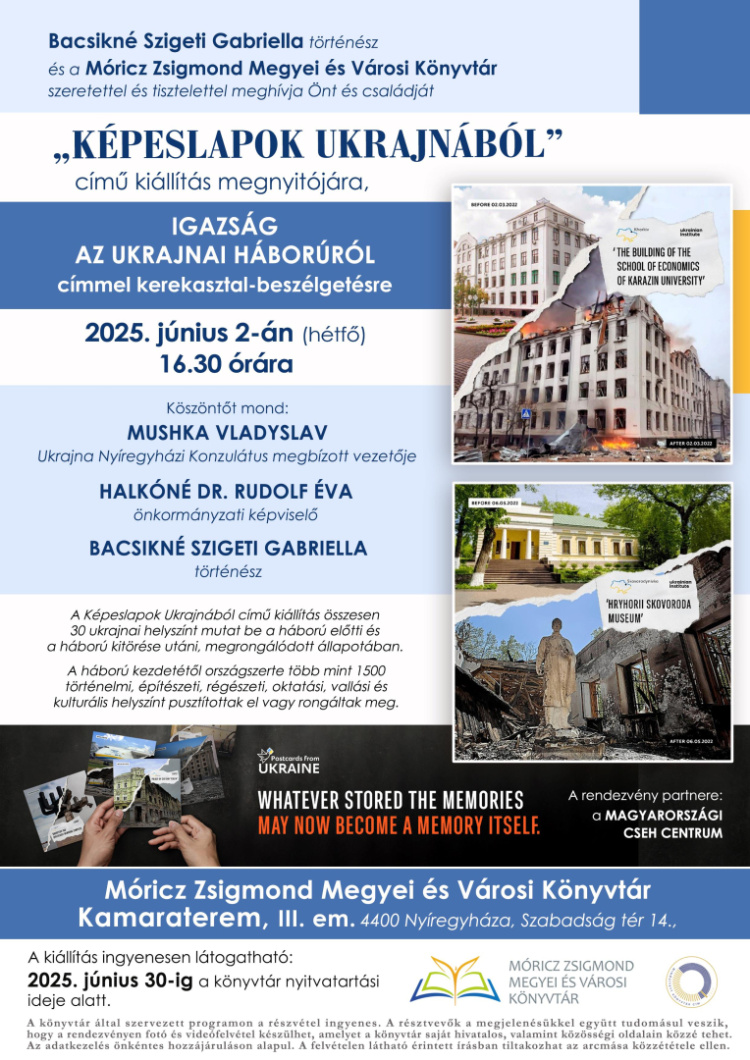 A kiállítás 30 képben mutatja be a háború előtti és a háború kitörése utáni, megrongálódott épületeket. A kiállítás ingyenesen megtekinthető könyvtárunk nyitvatartási ideje alatt 2025. június 30-ig.