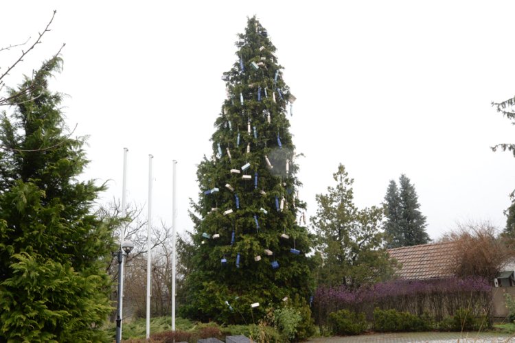 Az emlékpark feldíszített fája mellett ünneplik a karácsonyt