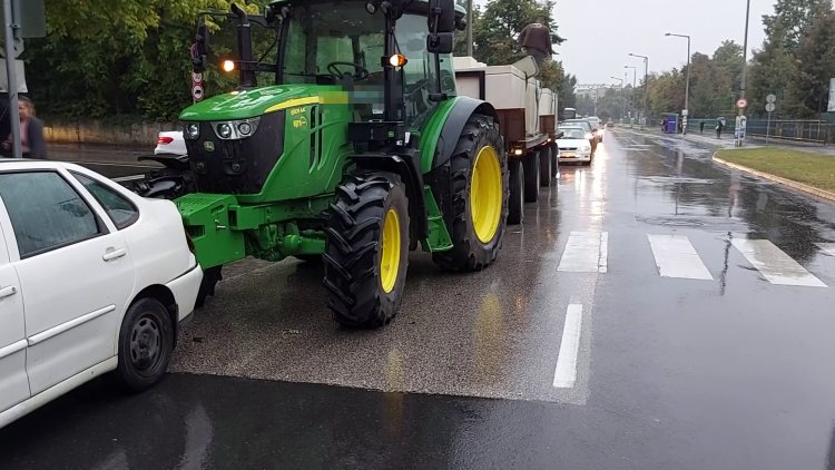 Nem tartott megfelelő követési távolságot egy traktor két pótkocsival és belecsúszott egy személyautóba, ami forgalmi okok miatt lassított a Sóstói út – Garibaldi utcai kereszteződésben. A traktor vezetője nem ismerte el a felelősségét, a hatóság segítségét kérték.