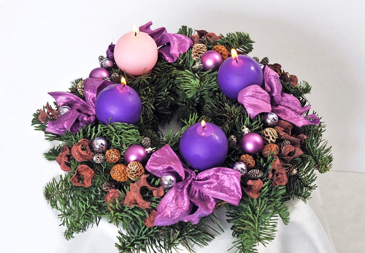 Az adventi koszorú ősét 1839-ben készítette egy Johann W. Wichern nevű evangélikus lelkipásztor: egy örökzölddel díszített szekérkeréken 24 gyertyát helyezett el, melyek közül minden nap eggyel többet gyújtott meg karácsonyig. Ma az adventi koszorút négy gyertya díszíti, ezek színeit a római katolikus liturgiából kölcsönözzük. Az adventi időszak és az adventi gyertyák színe általában lila (advent ugyanis – a húsvéti előtti időszakhoz hasonlóan – nemcsak a várakozás, hanem a böjt és a bűnbánat időszaka is, amit a katolikus liturgiában lila színnel jelölnek), kivéve egyet. A gyertyagyújtás sorrendjében a harmadik gyertya színe rózsaszínű, mivel a (bűn)bánatba már egy kis öröm is keveredik, ahogy egyre közeledik a karácsony.