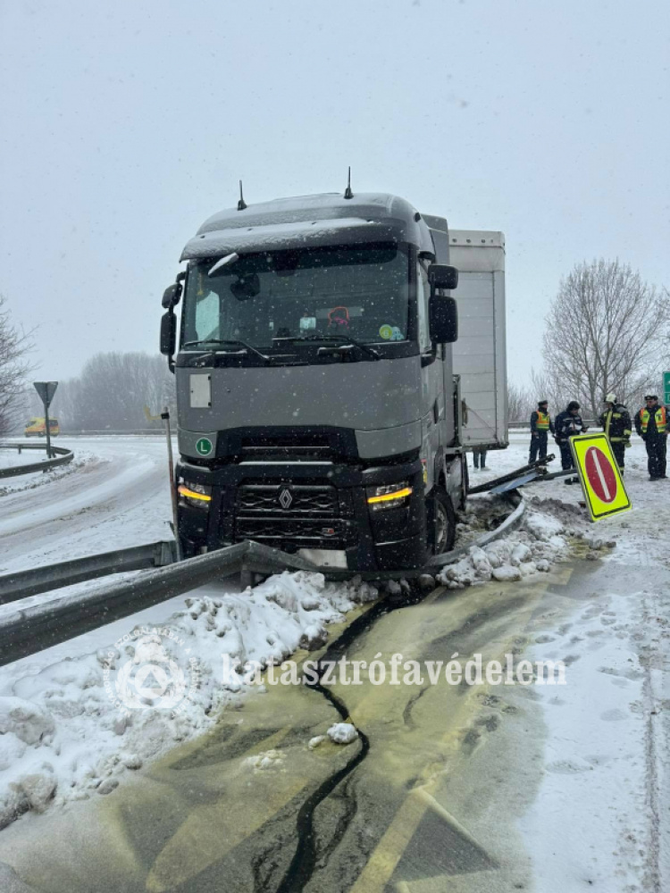 Két kamion is elakadt a 4-es főúton a nagy havazásban
