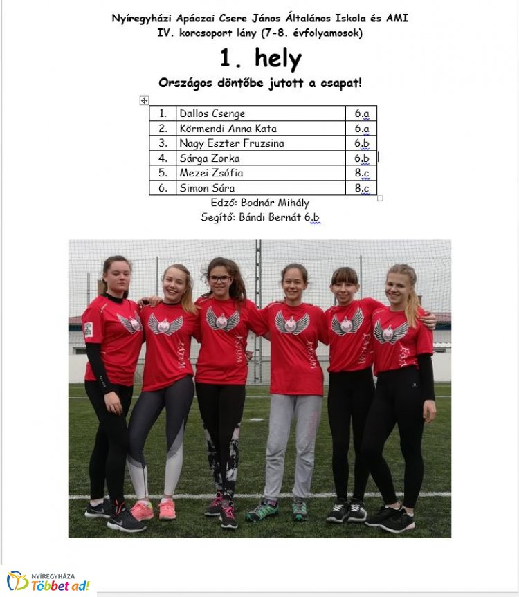 A II. korcsoport (3-4. évfolyamosok) vegyes kategóriájában második helyezést értek el, míg a III. korcsoport (5-6. évfolyamosok) vegyes kategóriájában és a IV. korcsoport (7-8. évfolyamosok) lány kategóriájában az első helyet sikerült megszerezni. Így mind a három csapat tagjai jogosultságot szereztek arra, hogy részt vegyenek 2019. május 25-én a gödöllői országos döntőn.