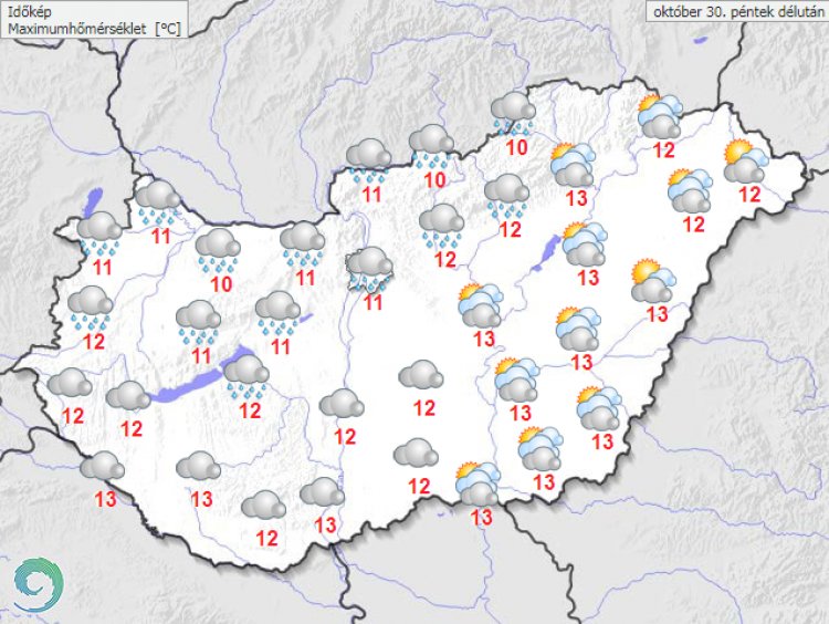Hajnalban még északkeleten, napközben pedig már több helyen – előbb a Dunántúl északi részén, később keletebbre – valószínű gyenge eső. A délnyugatira forduló szél csak néhol élénkül meg. A legmagasabb nappali hőmérséklet 9 és 14 fok között valószínű. Késő estére 7 és 12 fok közé hűl le a levegő.