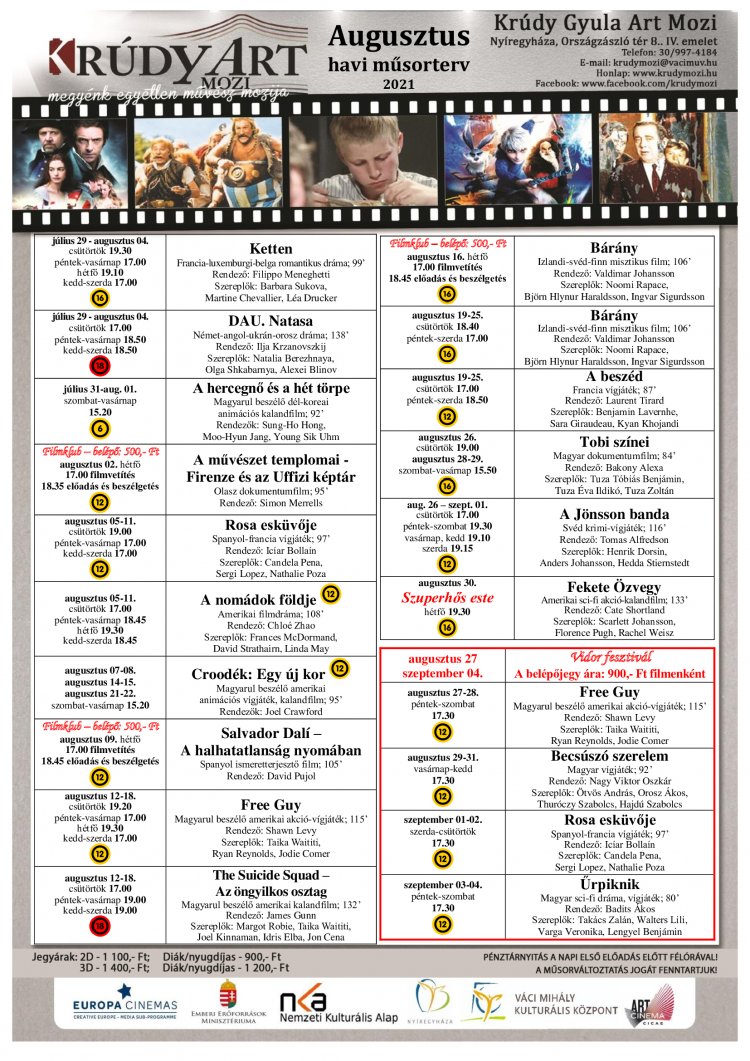 Ketten, Rosa esküvője, DAU. Natasa, A hercegnő és a hét törpe című filmek is szerepelnek megyénk egyetlen művész mozijának augusztusi filmkínálatában. (Részletes műsorterv!)