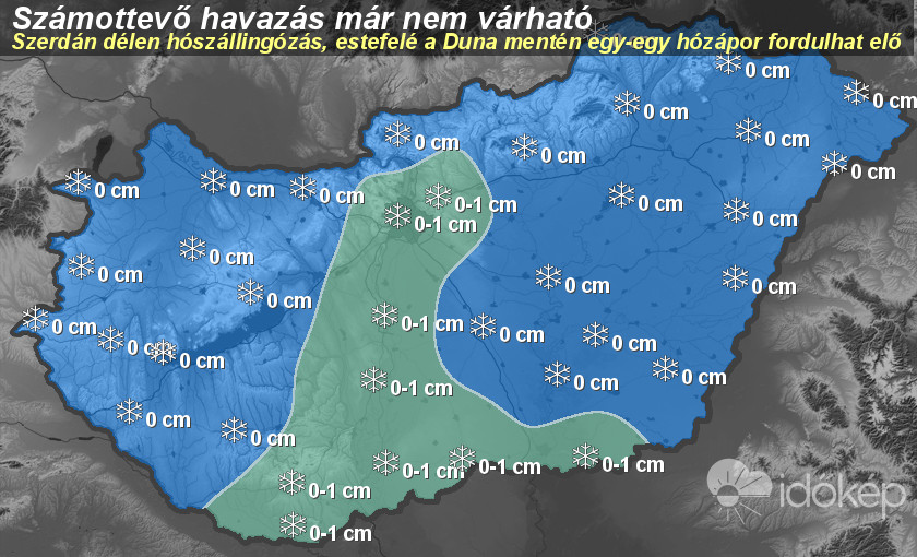 Szerdán kisebb havazás főként a déli megyékben még előfordulhat, este a középső tájakon hózáporok alakulhatnak ki. Az északias szél sokfelé lesz élénk, nyugaton és északkeleten erős, viharos széllökések lehetnek. Itt továbbra is lehet kisebb hófúvásokra készülni. A hajnal fagyos marad, délutánra viszont már szinte mindenhol fagypont fölé, 1-6 fokig emelkedik a hőmérséklet.