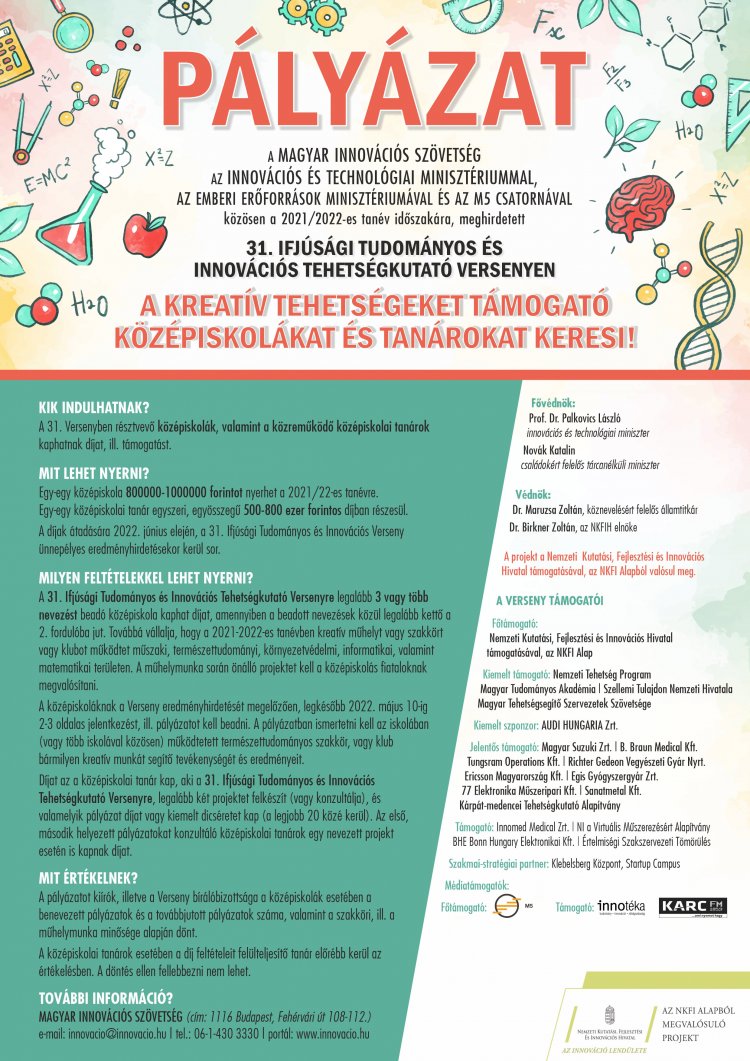 A Magyar Innovációs Szövetség az Innovációs és Technológiai Minisztériummal, valamint az Emberi Erőforrások Minisztériumával közösen, a Nemzeti Kutatási, Fejlesztési és Innovációs Hivatal főtámogatásával meghirdeti a 31. Ifjúsági Tudományos és Innovációs Tehetségkutató Versenyt. Az idei kiírás szerint a kreatív fiatalok összesen ötmillió forint jutalmat kaphatnak, míg a dobogós helyezés 100 többletpontot fog érni a 2022. évi egyetemi felvételi eljárás során. A legeredményesebb felkészítő tanárok és középiskolák szintén kiemelt támogatásban részesülnek.