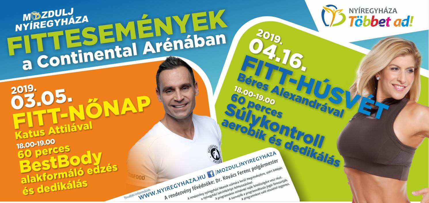 A hétköznapi és hétvégi mozgásrendek mellett, kezdődnek a fittesemények is. Tavasszal Fitt-Nőnap és Fitt-Húsvét várja a mozgás szerelmeseit a Continental Arénában. 2019. március 5-én újra Katus Attila érkezik Nyíregyházára. A világ- és Európa–bajnok, személyi edző, életmód tanácsadó nem első ízben jár majd a szabolcsi megyeszékhelyen. Legutóbb tavaly novemberben mozgatta át a Nyíregyháziakat. Jövőhéten kedden egy 60 perces BestBody aerobik órát tart majd, illetve azt követő dedikálás sem marad el. A rendezvény ingyenes, belépés kizárólag nyíregyházi lakcímkártya felmutatásával lehetséges.