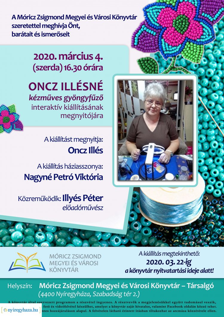 Oncz Illésné kézműves gyöngyfűző kiállítása fogadja az érdeklődőket március 4-től 22-ig a Móricz Zsigmond Megyei és Városi Könyvtár társalgójában.