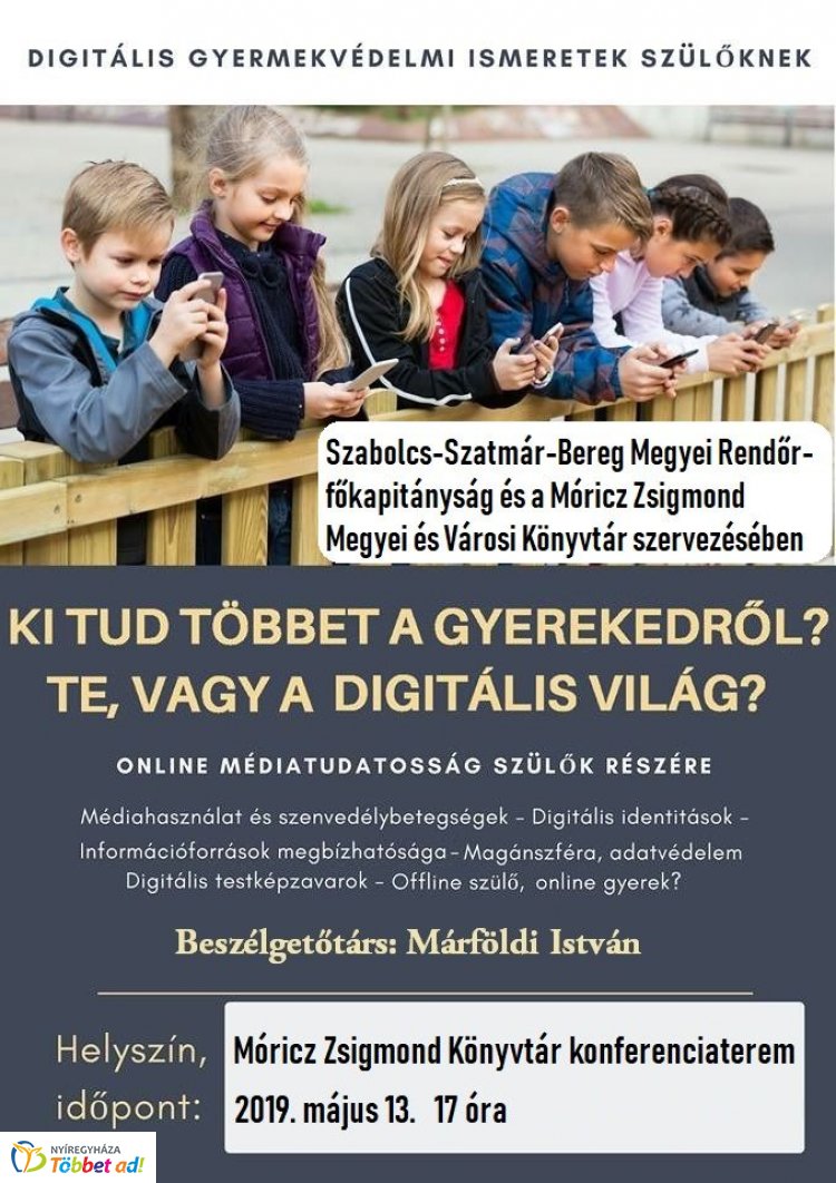 Május 13-án, 17 órától digitális gyermekvédelmi ismeretekkel gazdagodhatnak a szülők a Móricz Zsigmond Könyvtár konferenciatermében.