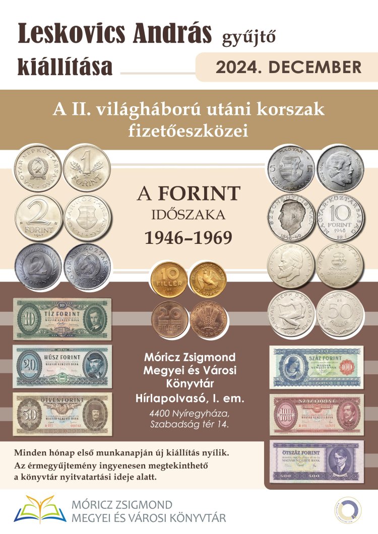 Ismerje meg a II. világháború utáni korszak fizetőeszközeit; ez volt forint időszaka 1946-tól 1969-ig. Leskovics András gyűjtő kiállítása a Móricz Zsigmond Megyei és Városi Könyvtárban várja decemberben.