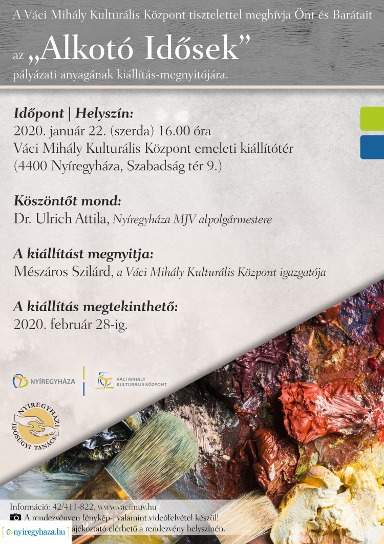A szépkorúak számára kiírt képzőművészeti pályázatra beérkezett alkotások tekinthetők meg január 22-től február 28-ig a Váci Mihály Kulturális Központban. A kiállítás-megnyitót a magyar kultúra napján, 16 órakor tartják.