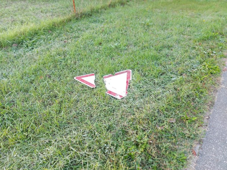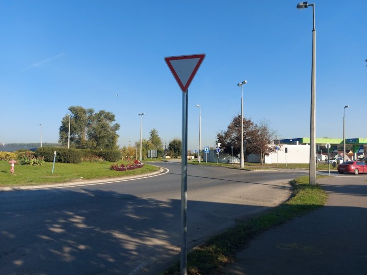 Kidöntött egy elsőbbségadás kötelező táblát egy eddig ismeretlen autós a Fészek utcai körforgalomban.
