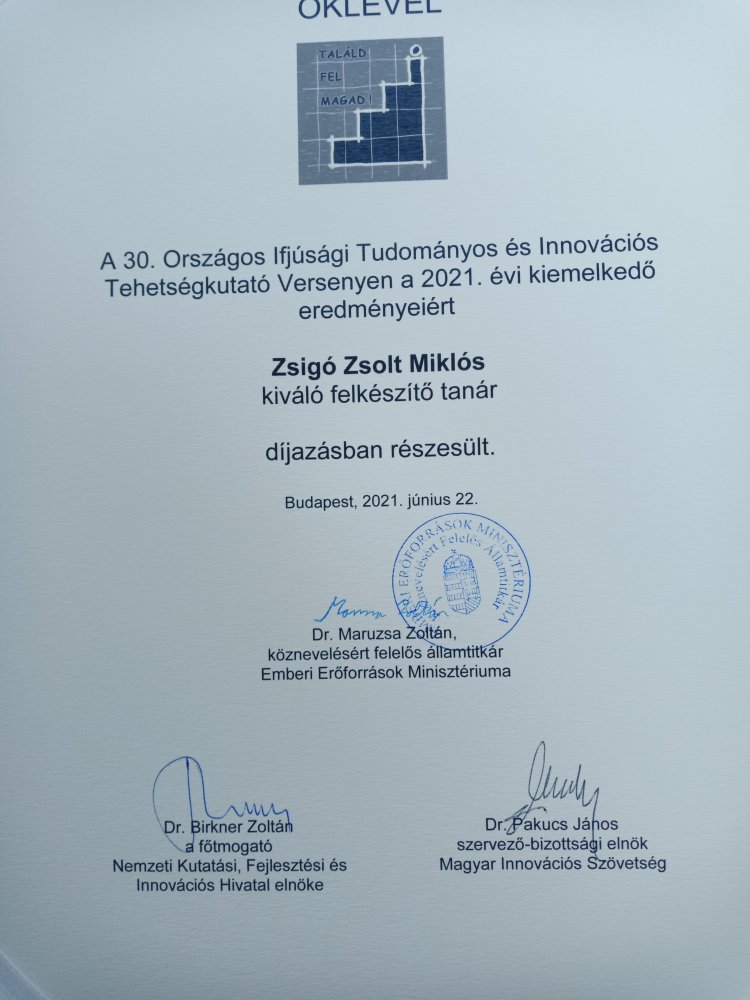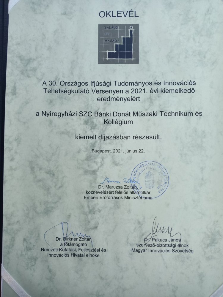A 30. Országos Ifjúsági Tudományos és Innovációs Tehetségkutató Versenyen a 2021. évi kiemelkedő eredményeiért a Nyíregyházi SZC Bánki Donát Műszaki Technikum és Kollégium kiemelt díjazásban-, Zsigó Zsolt Miklós pedig kiváló felkészítő tanár díjazásban részesült.