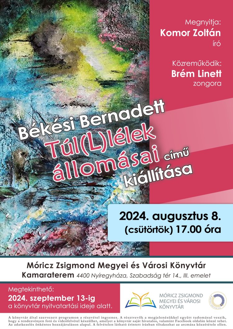 Megnyílik Békési Bernadett Túl(l)lélek című festménykiállítása. A tárlatot Komor Zoltán méltatja, Brém Linett pedig zongoradallamokkal teszi még élvezhetőbbé.