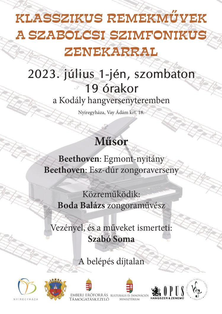 A Szabolcsi Szimfonikus Zenekar Beethoven-művekkel várja a komolyzene kedvelőit július 1-jén, a Kodály hangversenyteremben. Közreműködik Boda Balázs zongoraművész, vezényel Szabó Soma. A belépés díjtalan.