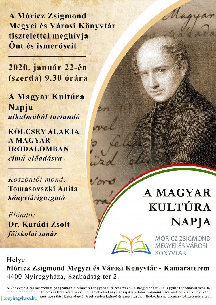 Dr. Karádi Zsolt főiskolai tanár előadásával tiszteleg Kölcsey Ferenc emléke előtt a Móricz Zsigmond könyvtár a Magyar Kultúra Napján, január 22-én.