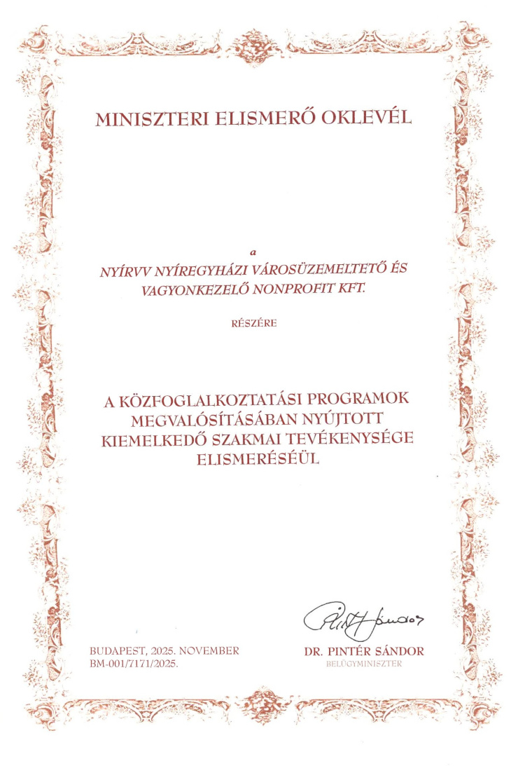 A Belügyminisztérium idén is átadta a Start Plusz díjakat, amellyel azokat a közfoglalkoztatókat ismerik el, akik a programok szervezésében és végrehajtásában kiemelkedő, elhivatott munkát végeznek. Nagy megtiszteltetés, hogy a NYÍRVV Nonprofit Kft. hajléktalan közfoglalkoztatási programja 2025-ben a díjazottak között szerepel. A miniszteri elismerésben azok a szervezetek részesülhetnek, akik a helyi igényekre építve, szakmailag kimagasló színvonalon dolgoznak, szabályszerűen és pontosan valósítják meg programjaikat, valamint eredményesen koordinálják a közfoglalkoztatottak munkáját.