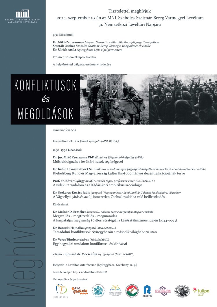 A nyíregyházi levéltári napot 2024-ben már 31-dik alkalommal rendezik meg. A rendezvénynek több célja van: a helyi tudományos élet egyik bázisintézményeként szeretnék, ha az érdeklődők a helytörténetkutatás és a történettudomány legújabb eredményeiről ízelítőt kaphatnának, fontosnak tartják a saját munkák és eredmények folyamatos kommunikálását, valamint a szakmai kapcsolatépítések fontos platformja az éves nagyrendezvény. A tudományos konferencia címe Konfliktusok és megoldások, amelynek keretében a történelem olyan epizódjait kívánják felidézni, amelyek megváltoztatták a térség és a térségben élők életét. Céljuk, hogy az eseményfeltáráson túlhaladva a források feldolgozásának más megközelítési módjait mutassák be, illetve az országos traumák és kivezető utak helytörténeti megjelenésére is rámutassanak.
