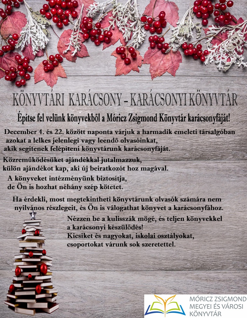 December 4. és 22. között naponta várjuk a harmadik emeleti társalgóban azokat a lelkes jelenlegi vagy leendő olvasóinkat, akik segítenek felépíteni könyvtárunk karácsonyfáját. Közreműködésüket ajándékkal jutalmazzuk, külön ajándékot kap, aki új beiratkozót hoz magával. A könyveket intézményünk biztosítja, de Ön is hozhat néhány szép kötetet. Ha érdekli, most megtekintheti könyvtárunk olvasók számára nem nyilvános részlegeit, és Ön is válogathat könyvet a karácsonyfához. Nézzen be a kulisszák mögé, és teljen könyvekkel a karácsonyi készülődés! Kicsiket és nagyokat, iskolai osztályokat, csoportokat várunk sok szeretettel.