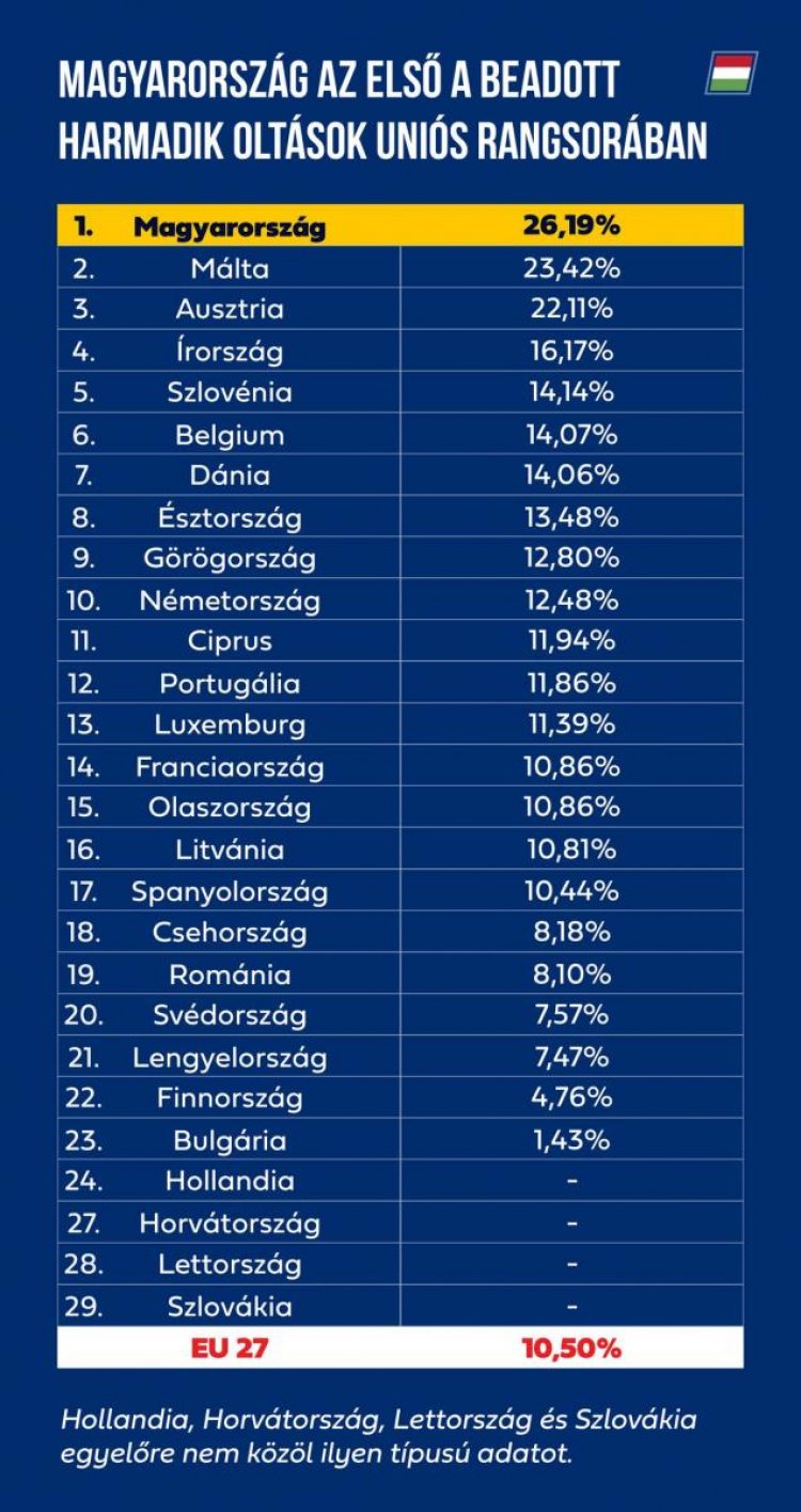 A táblázat szerint Magyarországon a beadott harmadik oltások aránya 26,19 százalék, ez a legmagasabb az uniós országok összehasonlításában.