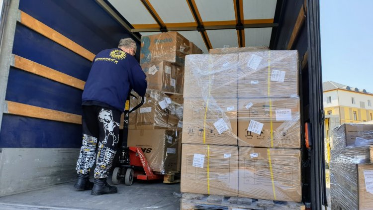 Pumpálta a kézi targoncát, majd a hidraulikus emelőhöz húzta a szállítmány egy részét a kamionsofőr a kórház udvarán. Az áru ezt követően már a kórház kézi targoncájára került át és egy egészségügyi dolgozó segítségével a raktárba gurították.
