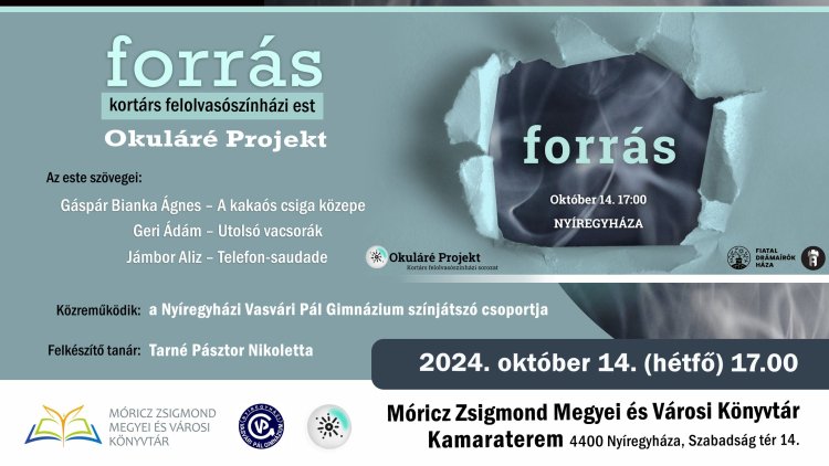 Kortárs felolvasószínházi esttel készül az Okuláré Projekt. A Forrás című előadásukat a Nyíregyházi Vasvári Pál Gimnázium színjátszó csoportja adja elő október 14-én, 17:00-kor a Móricz Zsigmond Megyei és Városi Könyvtár - Kamaratermében.