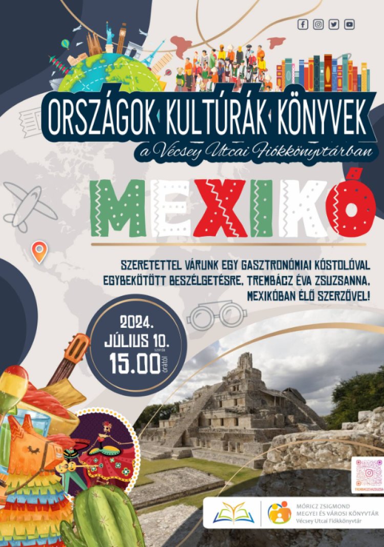 A mexikói kultúráról mesél Trembácz Éva Zsuszanna szerdán, július 10-én 15 órától a Vécsey utcai könyvtárban. Szeretettel várnak mindenkit, akit érdekel Mexikó és szeretne megkóstolni egy klasszikus mexikói finomságot.