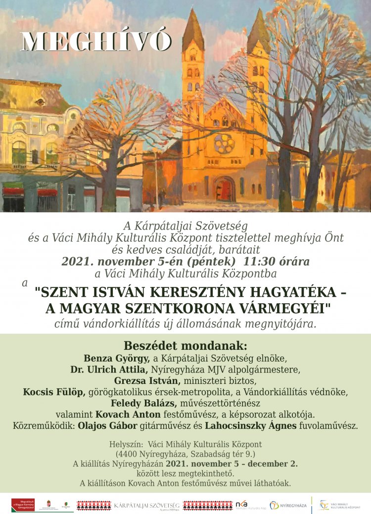A Kárpátaljai Szövetség Szent István Keresztény Hagyatéka - A Magyar Szentkorona Vármegyéi című vándorkiállítás novemberben Nyíregyházára érkezik. Kovach Anton festőművész képsorozata november 5-től december 2-ig fogadja a látogatókat a Váci Mihály Kulturális Központban.