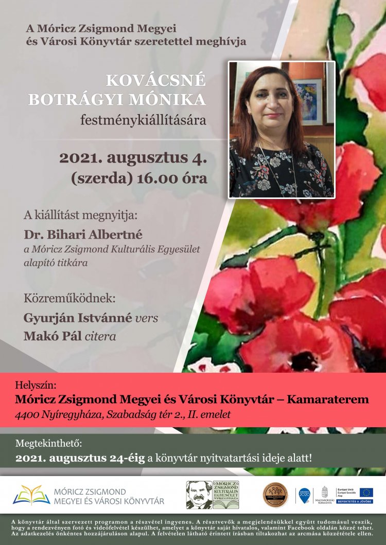 Kovácsné Botrágyi Mónika festményeiből nyílik kiállítás augusztus 4-én a Móricz Zsigmond Megyei és Városi Könyvtár kamaratermében. A tárlat augusztus 24-ig fogadja a látogatókat.