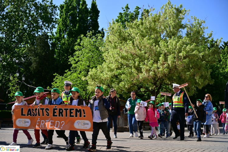 A város egyik legforgalmasabb részén rendőrségi kísérettel sétáltak át a gyerekek, akik „Lassíts értem” feliratú táblákkal hívták fel az autósok figyelmét. Az óvodások a Nagy Imre térre siettek, ahol idén is interaktív programok várták őket. Népszerű volt a rendőrségi motor kipróbálása, egymás után ültek fel a járműre az óvodások. A KRESZ kerék megpörgetésével játékosan tanulhattak a közlekedési szabályokról. Volt még kerékpáros kresz pálya is, ahol két keréken próbálhatták ki ügyességüket a gyerekek. A biciklikkel egy kanyargós pályán kellett végig haladniuk egy egyirányú szakaszon, majd megállniuk a stop feliratnál.